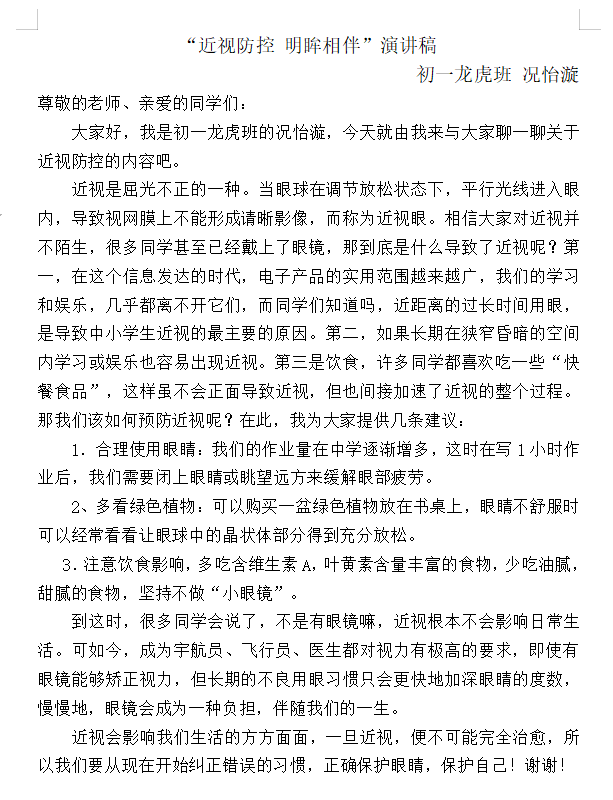 學校組織同學們開展了“近視防控宣傳月”主題教育晨會,學生代表況怡漩進行“國旗下演講”,與同學分享了近視防控的經(jīng)驗,并全體學生發(fā)出倡議——預(yù)防近視,從我做起。